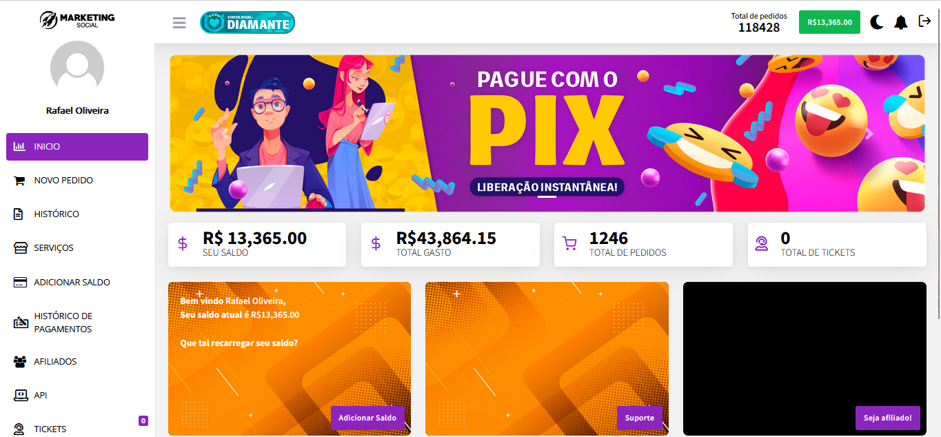 Para começar a usar a plataforma e fazer pedidos o primeiro passo é Adicionar Saldo. Depois você poderá fazer pedidos de seguidores, curtidas, visualizações, comentários e muito mais.
